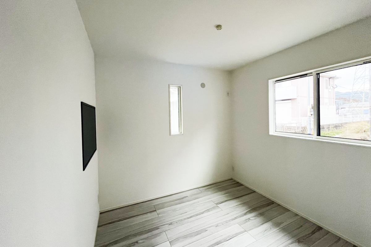 大きな窓から明るい光が降り注ぐ洋室は白い壁とフローリングで統一されており、清潔感と開放感を演出。