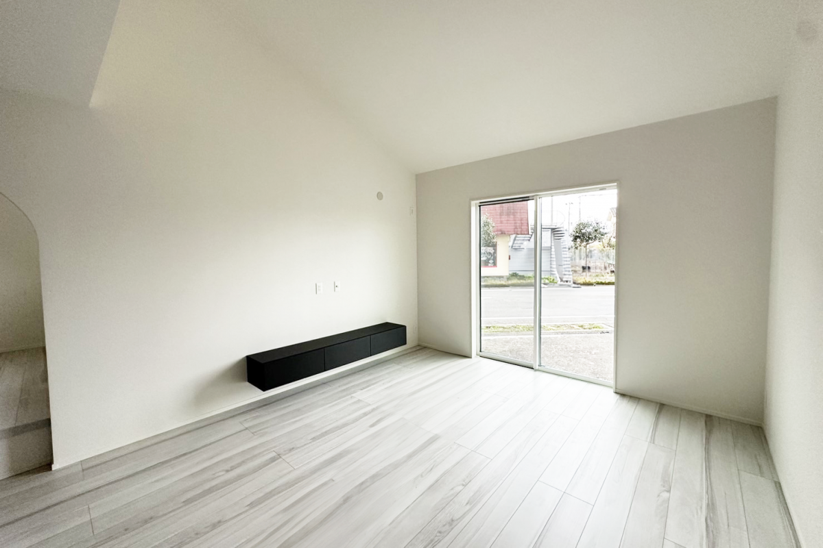 大きな窓から差し込む自然光がリビングルームを明るくし、開放感を演出します。