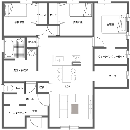 ヌックを備えており、趣味や在宅ワーク、お勉強にも便利な空間となっています。