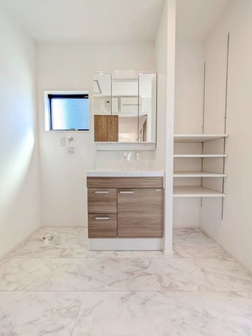 【洗面脱衣室】 忙しい朝の身支度もスムーズに行える、シャワーホースを引き出して使える洗面化粧台です。 収納も充実しているので、タオルや洗剤などもすっきりと片付き、いつも清潔で快適な空間を保てます。
