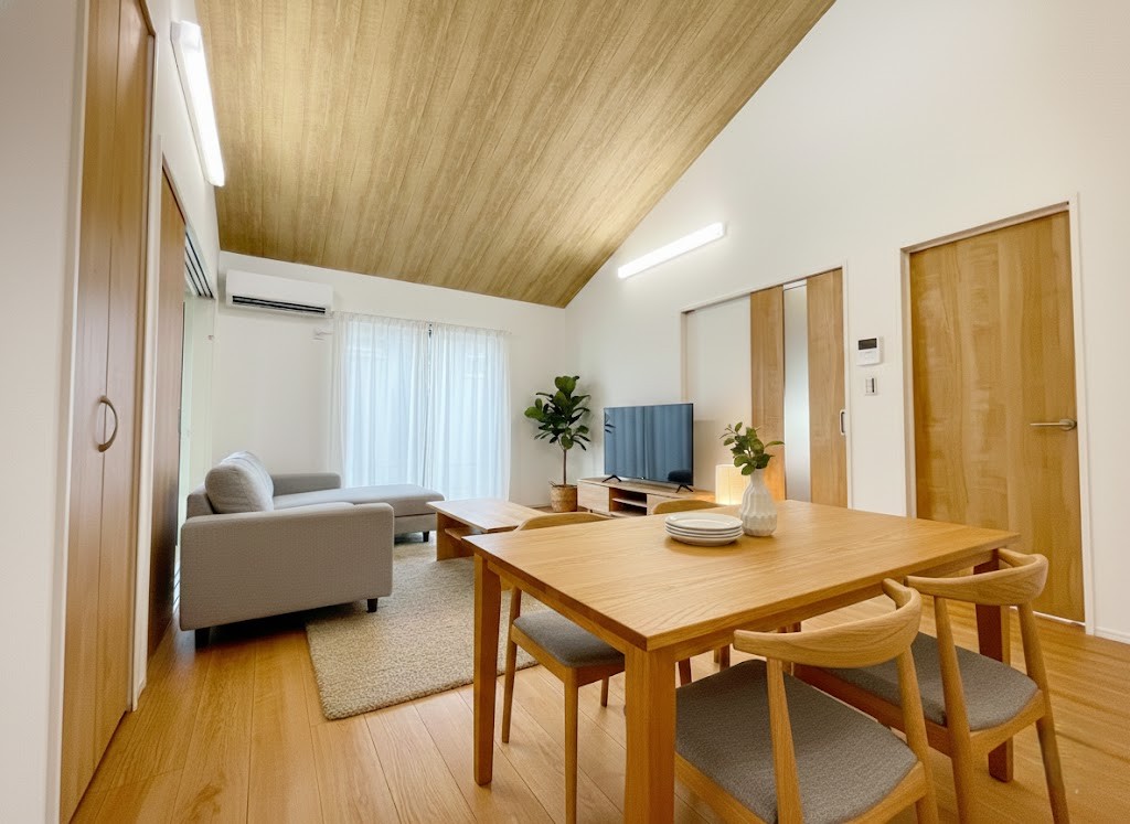 【リビング】勾配天井で、明るく開放的な空間の家族集まるリビングダイニングです。※画像はイメージです。 窓も大きく光が入り家族の団らんにぴったりな温かい雰囲気です。