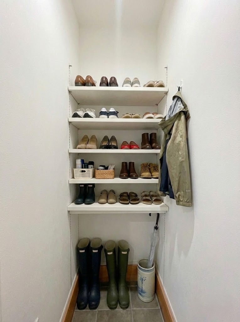 【SIC】 シューズクロークは可動タイプの棚なので、高さに合わせて収納できます。※画像はイメージです。 お庭で使うものやベビーカーなどスッキリまとめられます。