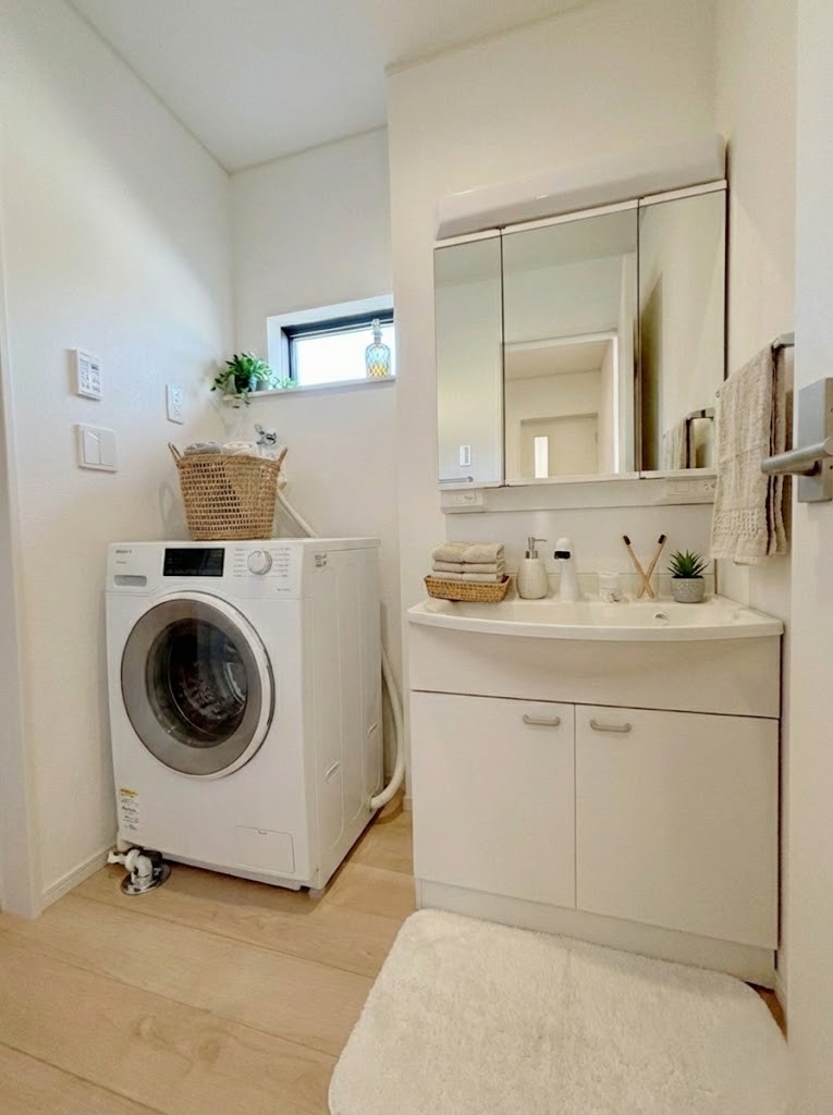 脱衣スペースに三面鏡付きの洗面化粧台。曇り止め付きのミラーキャビネットを採用。※画像はイメージです。