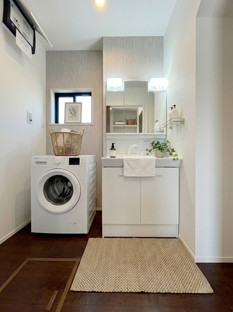 脱衣スペースに三面鏡付きの洗面化粧台。曇り止め付きのミラーキャビネットを採用。※画像はイメージです。