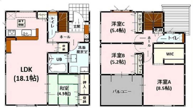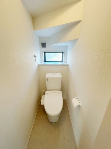 窓もあって通気性も良い高機能トイレ。各階にトイレを完備、朝の忙しい時間も安心です。