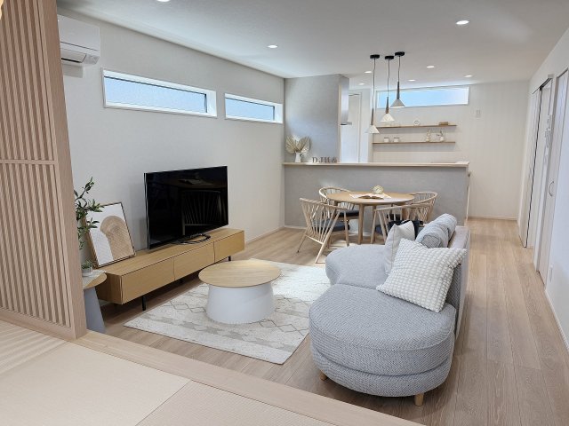 キッチンから見渡せる小上がり和室のあるLDK。高窓が周囲の視線を遮りつつ明るさを確保します。