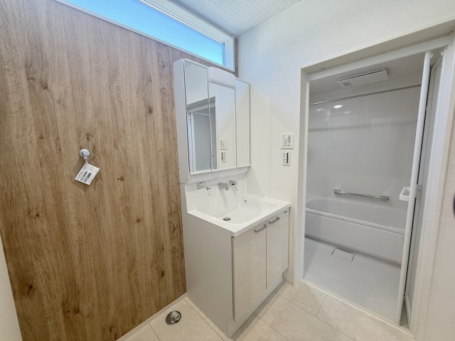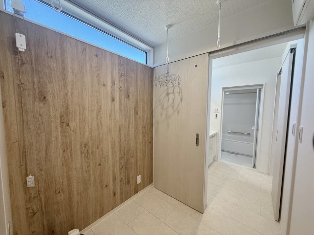 木目調のアクセント壁が美しいランドリールーム。高窓のある明るい空間で、部屋干しが可能です。