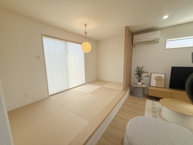 小上がりの和室スペースでは、高窓からの採光とこだわりの照明が、洗練されたくつろぎ空間を演出します。