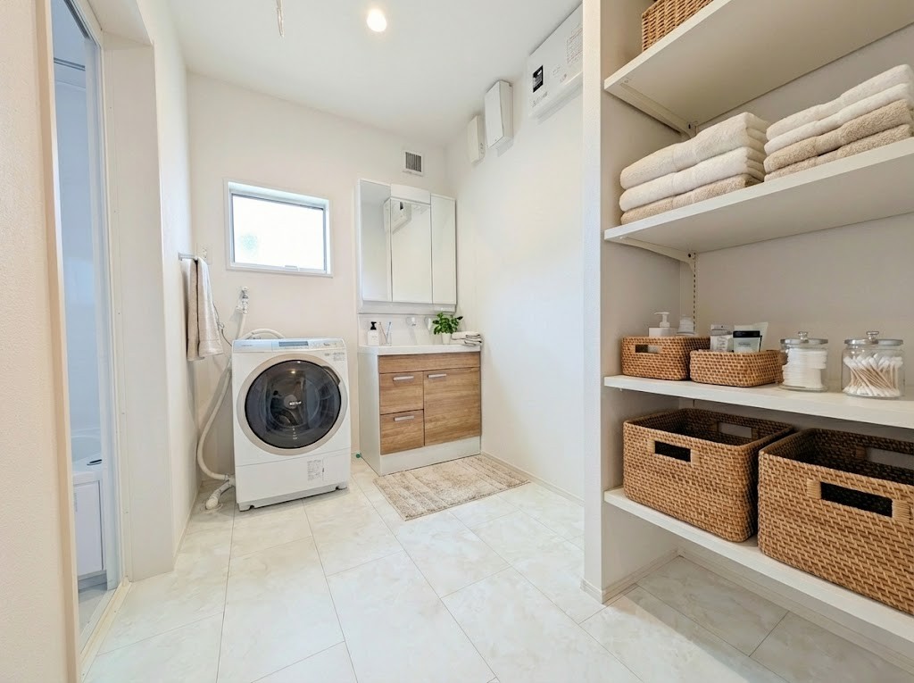 【洗面脱衣室】シャワー付きなので掃除も洗髪もでき、便利で快適な毎日になります。※画像はイメージです。 収納も充実しているので、タオルや洗剤などもすっきりと片付き、いつも清潔で快適な空間を保てます。