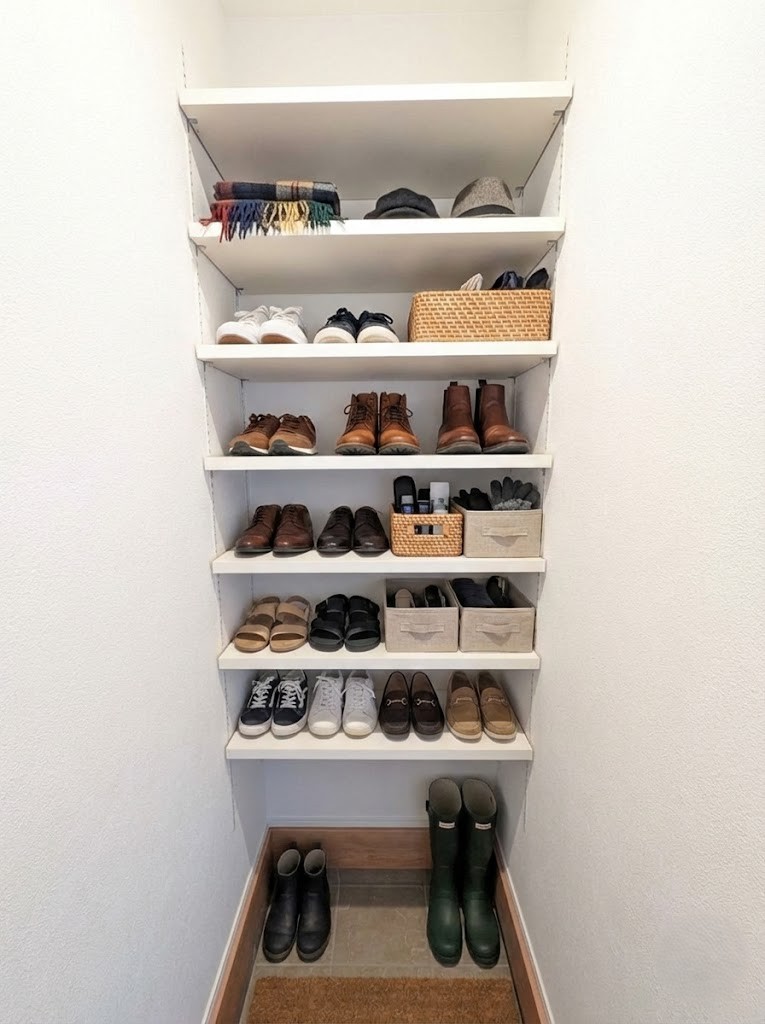 【SIC】 シューズクロークは可動タイプの棚なので、高さに合わせて収納できます。※画像はイメージです。 お庭で使うものやベビーカーなどスッキリまとめられます。