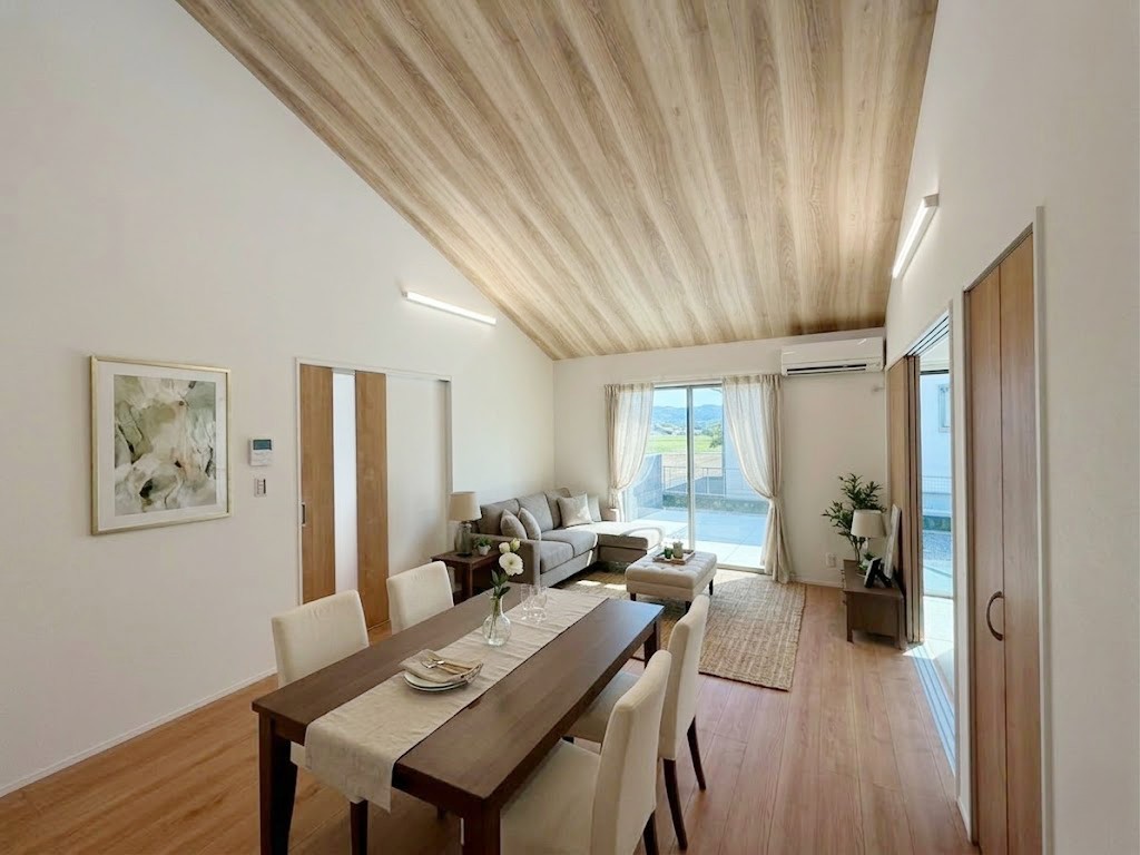 【リビング】勾配天井で、明るく開放的な空間の家族集まるリビングダイニングです。※画像はイメージです。 窓も大きく光が入り家族の団らんにぴったりな温かい雰囲気です。