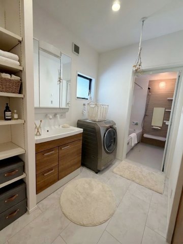 【洗面脱衣室】シャワー付きなので掃除も洗髪もでき、便利で快適な毎日になります。※画像はイメージです。 収納も充実しているので、タオルや洗剤などもすっきりと片付き、いつも清潔で快適な空間を保てます。