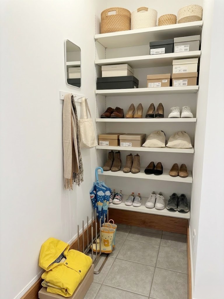 【SIC】 シューズクロークは可動タイプの棚なので、高さに合わせて収納できます。※画像はイメージです。 お庭で使うものやベビーカーなどスッキリまとめられます。