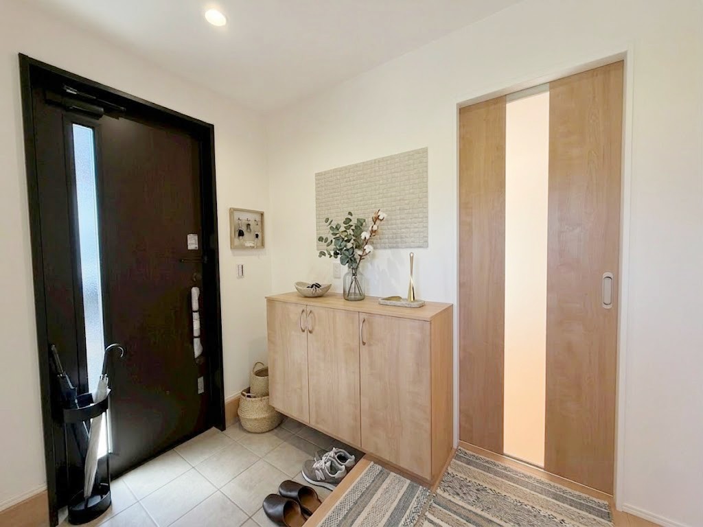 【玄関】明るくシューズボックス付の玄関。タイルはお掃除しやすく清潔を保てます。※画像はイメージです。 調湿性に優れたエコカラットは玄関のアクセントにもなります。