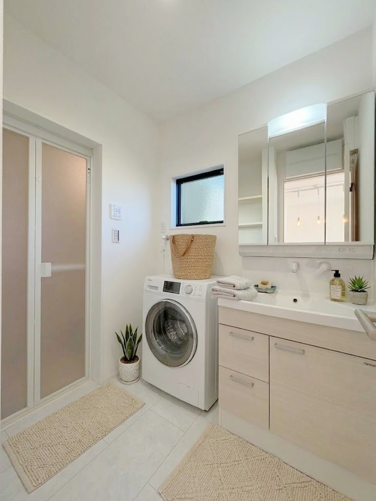 【洗面脱衣室】シャワー付きなので掃除も洗髪もでき、便利で快適な毎日になります。※画像はイメージです。 収納も充実しているので、タオルや洗剤などもすっきりと片付き、いつも清潔で快適な空間を保てます。