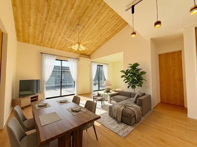 【リビング】勾配天井で、明るく開放的な空間の家族集まるリビングダイニングです。※画像はイメージです。 窓も大きく光が入り家族の団らんにぴったりな温かい雰囲気です。