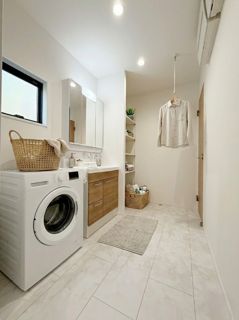 【洗面脱衣室】シャワー付きなので掃除も洗髪もでき、便利で快適な毎日になります。※画像はイメージです。 収納も充実しているので、タオルや洗剤などもすっきりと片付き、いつも清潔で快適な空間を保てます。