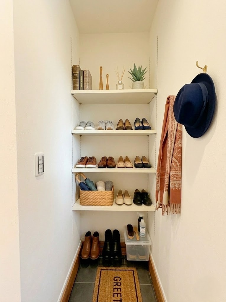 【SIC】 シューズクロークは可動タイプの棚なので、高さに合わせて収納できます。※画像はイメージです。 お庭で使うものやベビーカーなどスッキリまとめられます。