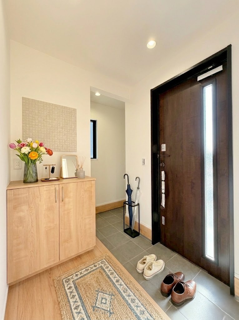 【玄関】明るくシューズボックス付の玄関。タイルはお掃除しやすく清潔を保てます。※画像はイメージです。 調湿性に優れたエコカラットは玄関のアクセントにもなります。