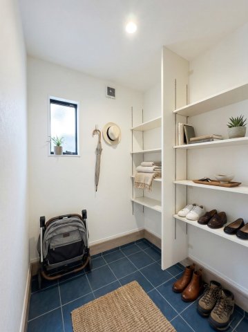 【SIC】 シューズクロークは可動タイプの棚なので高さに合わせて収納できます。※画像はイメージです。 お庭で使うものやベビーカーなどスッキリまとめられます。
