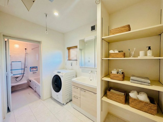 【洗面脱衣室】シャワー付きなので掃除も洗髪もでき、便利で快適な毎日になります。※画像はイメージです。 収納も充実しているので、タオルや洗剤などもすっきりと片付き、いつも清潔で快適な空間を保てます。