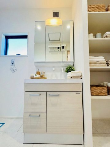 【洗面台】 収納充実のシャワー付洗面台は、朝の身支度もスムーズに行えます。※画像はイメージです。 ミラー裏収納も活用でき、化粧品や洗面用品などもすっきりと片付きます。
