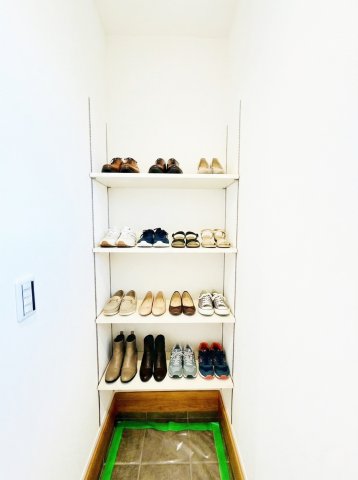 【SIC】 シューズクロークは可動タイプの棚なので高さに合わせて収納できます。※画像はイメージです。 お庭で使うものやベビーカーなどスッキリまとめられます。
