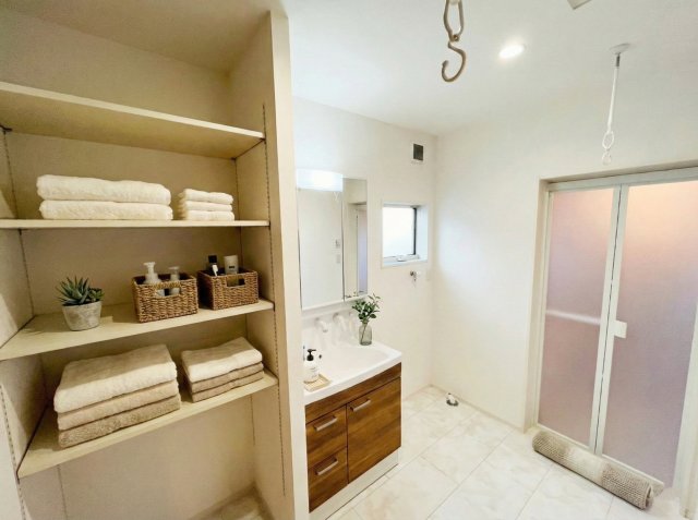 【洗面脱衣室】シャワー付きなので掃除も洗髪もでき、便利で快適な毎日になります。※画像はイメージです。 収納も充実しているので、タオルや洗剤などもすっきりと片付き、いつも清潔で快適な空間を保てます。