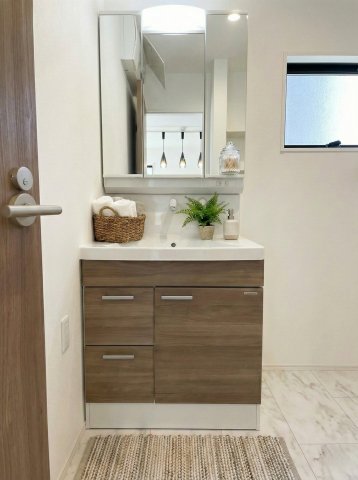 【洗面脱衣室】シャワー付きなので掃除も洗髪もでき、便利で快適な毎日になります。※画像はイメージです。 収納も充実しているので、タオルや洗剤などもすっきりと片付き、いつも清潔で快適な空間を保てます。