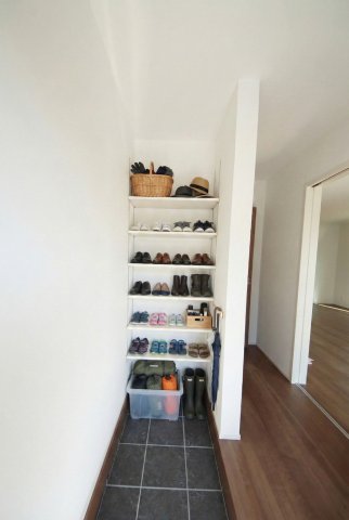 【SIC】 シューズクロークは可動タイプの棚なので高さに合わせて収納できます。※画像はイメージです。 お庭で使うものやベビーカーなどスッキリまとめられます。