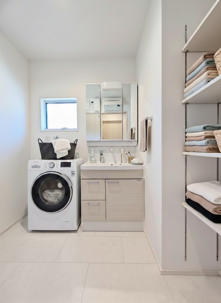 【洗面脱衣室】シャワー付きなので掃除も洗髪もでき、便利で快適な毎日になります。※画像はイメージです。 収納も充実しているので、タオルや洗剤などもすっきりと片付き、いつも清潔で快適な空間を保てます。