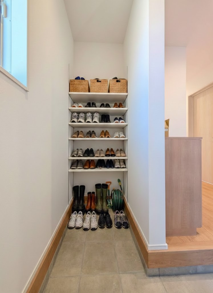 【SIC】 シューズクロークは可動タイプの棚なので、高さに合わせて収納できます。※画像はイメージです。 お庭で使うものやベビーカーなどスッキリまとめられます。