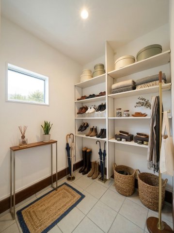【SIC】 シューズクロークは可動タイプの棚なので高さに合わせて収納できます。※画像はイメージです。 お庭で使うものやベビーカーなどスッキリまとめられます。