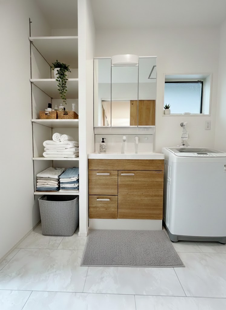 【洗面脱衣室】シャワー付きなので掃除も洗髪もでき、便利で快適な毎日になります。※画像はイメージです。 収納も充実しているので、タオルや洗剤などもすっきりと片付き、いつも清潔で快適な空間を保てます。