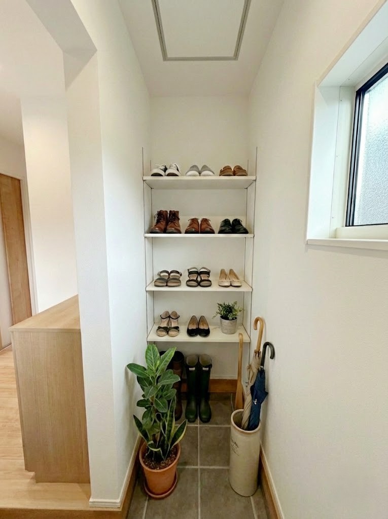 【SIC】 シューズクロークは可動タイプの棚なので、高さに合わせて収納できます。※画像はイメージです。 お庭で使うものやベビーカーなどスッキリまとめられます。